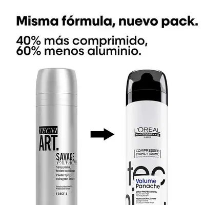 L'oreal Professionnel Tecni Art Volume Panache es un spray en seco diseñado para aportar un volumen inmediato y una textura salvaje sin apelmazar el cabello. Su innovadora fórmula micropropulsada con calcio carbonatado proporciona un acabado duradero, ligero y con un tacto seco, ideal para quienes buscan un look con carácter y movimiento natural.
