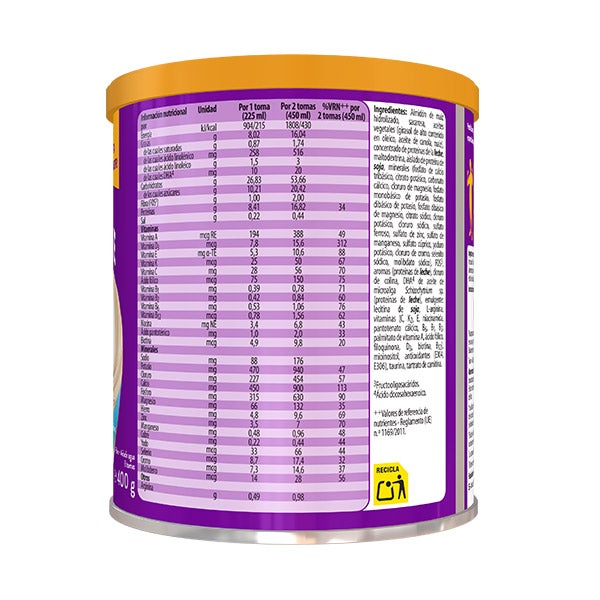Almidón de maíz hidrolizado, sacarosa, aceites vegetales (girasol de alto contenido en oleico, aceite de canola, maíz), concentrado de proteínas de la LECHE, maltodextrina, aislado de proteína de SOJA, minerales (fosfato de calcio tribásico, citrato potásico, carbonato cálcico, cloruro de magnesio, fosfato monobásico de potasio, fosfato dibásico de potasio, fosfato dibásico de magnesio, citrato sódico, cloruro potásico, cloruro sódico, sulfato ferroso, sulfato de zinc, sulfato de manganeso, sulfato cúprico, yoduro potásico, cloruro de cromo, selenito sódico, molibdato sódico), cacao en polvo, FOS7, aroma, cloruro de colina, DHA8 de aceite de microalga Schizochytrium sp. (proteínas de LECHE), emulgente: lecitina de SOJA, L-arginina, vitaminas (C, K2, E, niacinamida, pantotenato cálcico, B6, B1, B2, palmitato de vitamina A, ácido fólico, filoquinona, D3, biotina, B12), mioinositol, antioxidantes (E304, E306), taurina, tartrato de carnitina. SIN GLUTEN.