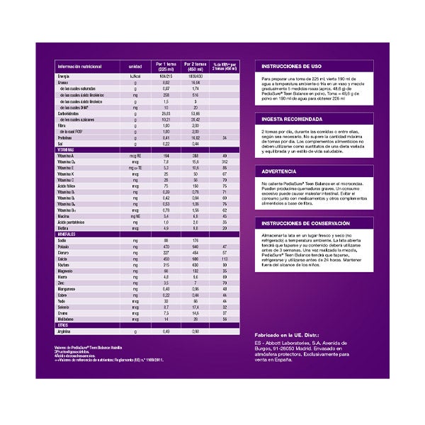 Advertencia: No calentar PediaSure Teen Balance en el microondas, ya que podría provocar quemaduras. El consumo excesivo podría ocasionar molestias intestinales. Evitar tomar junto con medicamentos u otros suplementos con fibra.
