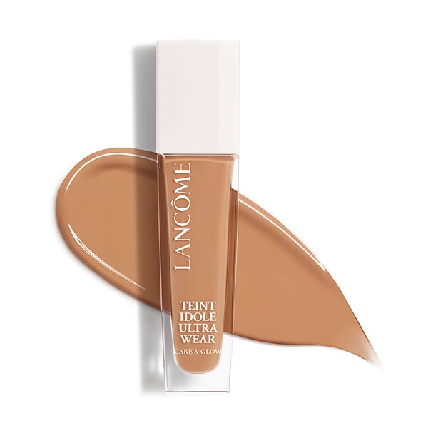 Teint Idole Ultra Wear Care & Glow Foundation ofrece un brillo saludable sin transferencia, permaneciendo intacta y sin acentuar las líneas de expresión.