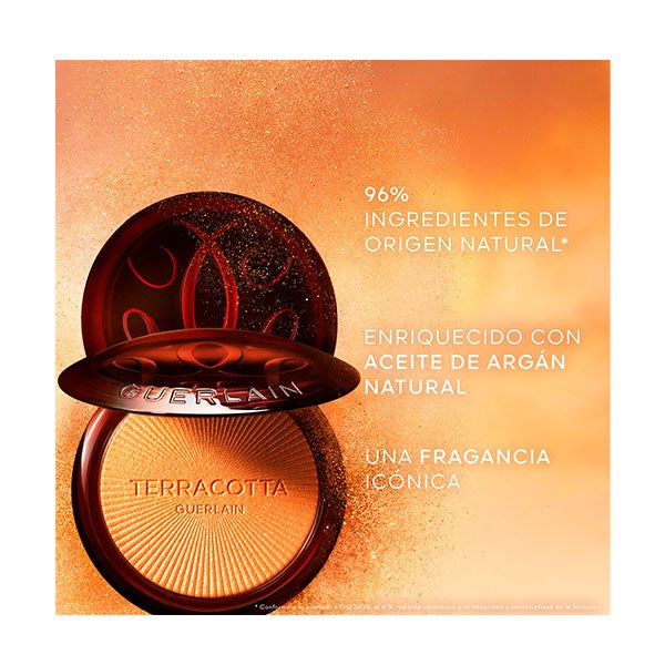 Los polvos iluminadores Terracotta Luminizer representan una auténtica revolución dentro de la colección de polvos faciales de Guerlain. Elaborados con un 96 % de ingredientes de origen natural¹, capturan la calidez del sol al atardecer a través de dos tonalidades de luminosidad intensa: un marfil rosado y un oro radiante, que aportan un efecto luminoso y seductor.