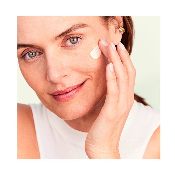 Toma una cantidad generosa de crema de día, frótala entre las manos para templarla y distribúyela sobre el rostro con las palmas, realizando movimientos desde el centro hacia fuera y evitando el contorno de los ojos.
