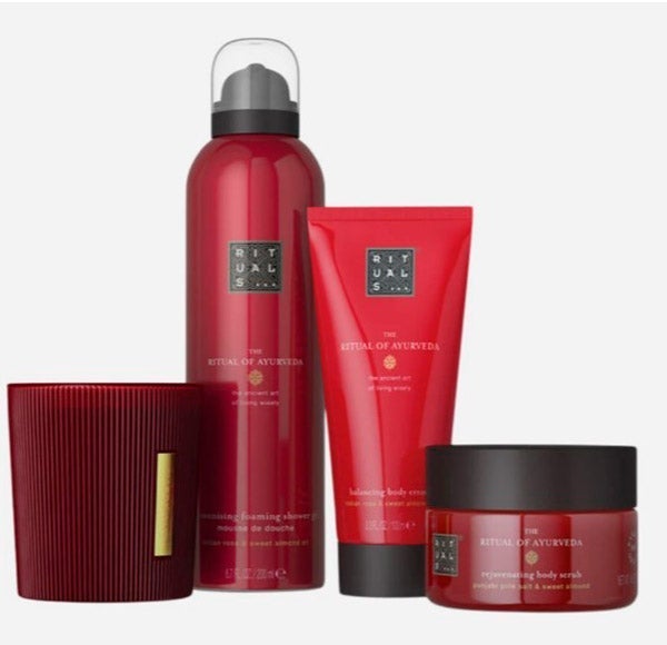 Incluye espuma de ducha, crema hidratante corporal, exfoliante y una vela con fragancia.