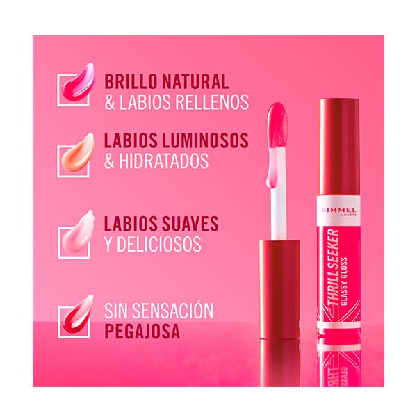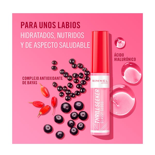 Thrillseeker Glassy Gloss de Rimmel London ofrece un efecto de volumen inmediato con un brillo intenso. Su exclusiva fórmula con ácido hialurónico y complejo antioxidante potencia la hidratación, dejando los labios visiblemente más suaves, nutridos y con un aspecto radiante.