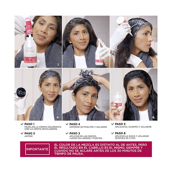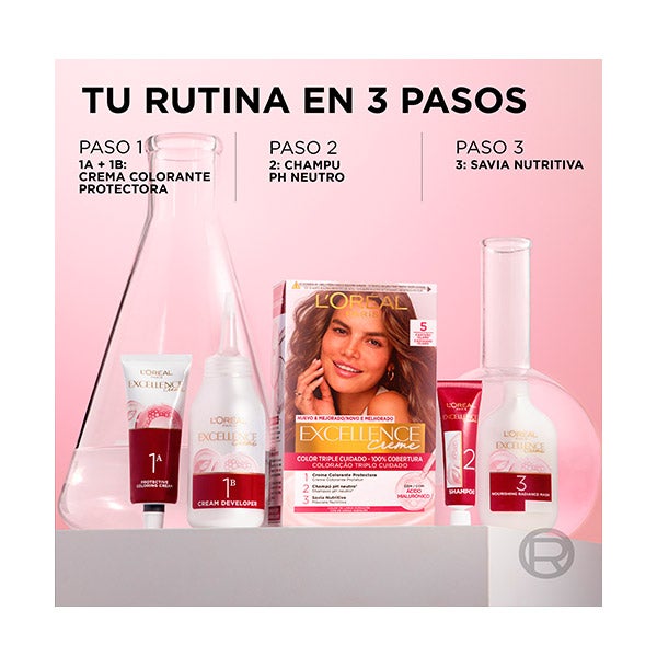 La Crema Color Triple Cuidado Avanzado Excellence, enriquecida con Pro-Keratina, Ceramida e Ionene G, ofrece una protección integral del cabello antes, durante y después del proceso de coloración, garantizando una cobertura total de las canas.