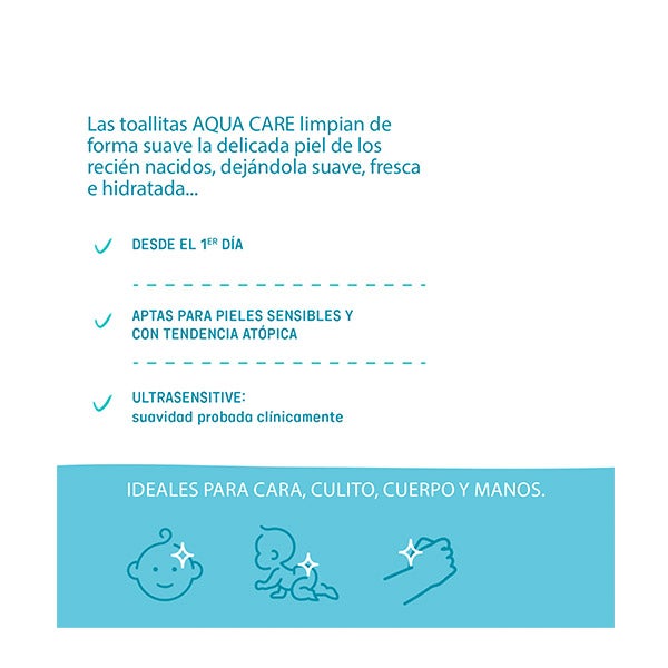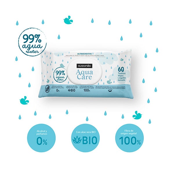 Las Toallitas Aqua Care Ultrasensitive de Suavinex son perfectas para limpiar con delicadeza y seguridad la piel más frágil de los recién nacidos.