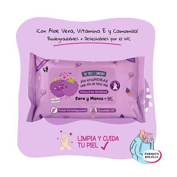 Las toallitas pocket The Fruit Company, con su delicioso perfume a moras, resultan perfectas para limpiar manos, rostro o el WC. Contienen Aloe Vera, Vitamina E y Camomila, lo que contribuye a mantener la piel limpia y suave. Son completamente biodegradables y se pueden desechar por el inodoro. Su tamaño mini permite llevarlas fácilmente a cualquier lugar. ¡Te enamorarán desde el primer uso!