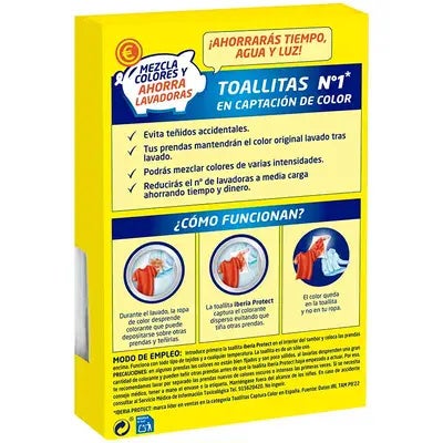 Durante el lavado, la ropa de color desprende colorante que puede depositarse sobre otras prendas y teñirlas. Las toallitas Iberia Protect actúan como un imán capturando el colorante disperso en el agua de la colada. De esta manera el colorante queda fijado en la toallita evitando que tiña otras prendas.