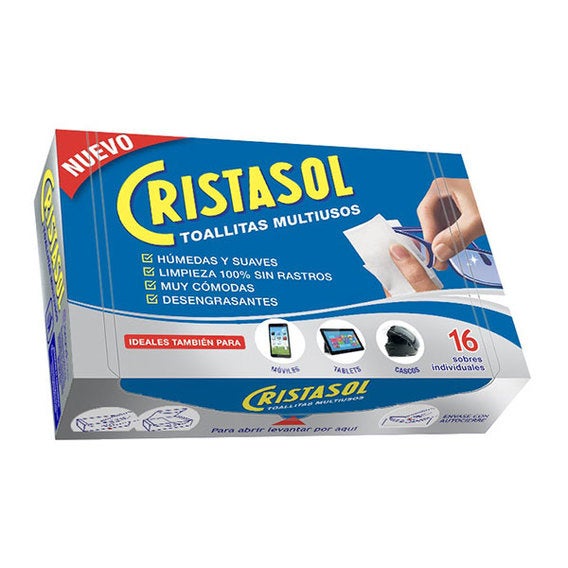 Las Toallitas Cristasol Multiusos húmedas desechables están especialmente recomendadas para la limpieza sin rastros de superficies delicadas, como las lentes de las gafas, tanto de la vista como las de sol, viseras de cascos, tablets, móviles u otras superficies sensibles. Vienen en sobres individuales, son cómodas y prácticas para utilizar en cualquier momento. Ideales porque no dañan la superficie y no dejan rastros. Han sido testadas en un laboratorio independiente, utilizando las herramientas para la realización de la prueba de resistencia a la abrasión, en conformidad con la norma EN ISO 8980-4.