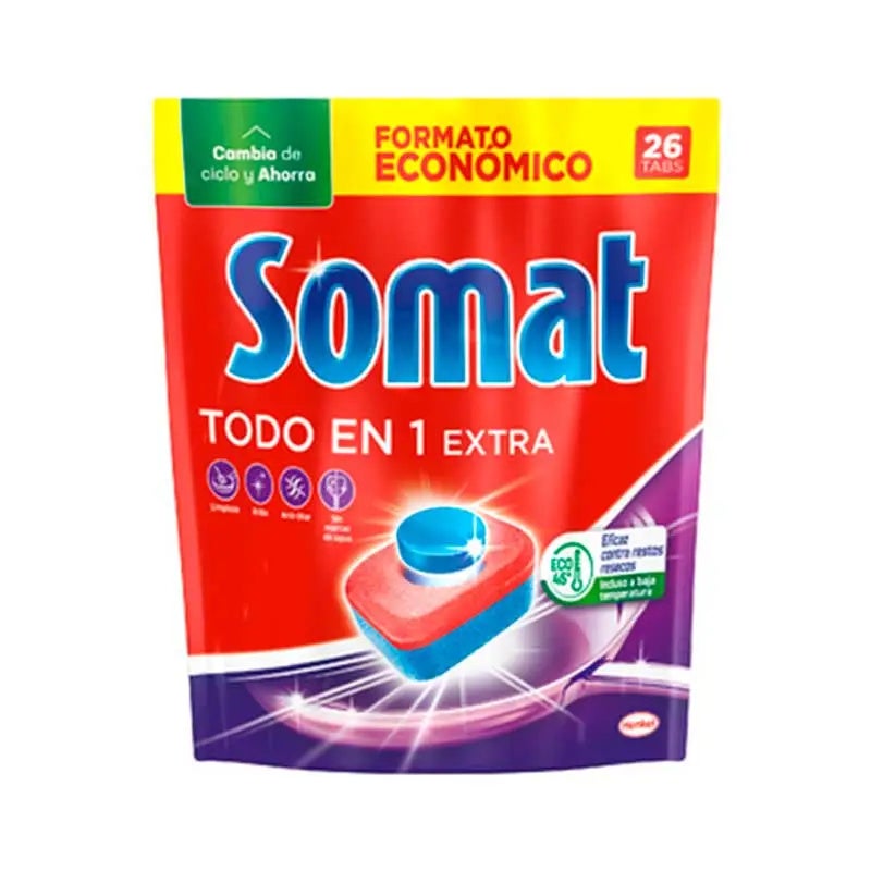 Somat todo en 1 es la solución perfecta para tu vajilla, porque su fórmula multifunción contiene las 5 funciones esenciales para ofrecer un resultado perfecto. Cinco efectos en una sola pastilla: detergente, abrillantador, función sal y antical, protege el cristal, eficaz incluso a baja temperatura.