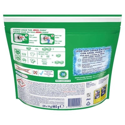 Rendimiento en Agua Fría: Ahorro de Energía y Cuidado de Tejidos - Uno de los grandes beneficios del Ariel Pods es su efectividad en ciclos de lavado con agua fría. La fórmula está diseñada para actuar de manera efectiva sin necesidad de altas temperaturas, lo que permite un ahorro de energía y es ideal para prendas que requieren lavado en frío. Este rendimiento hace que Ariel sea una opción amigable con el medio ambiente y excelente para proteger las fibras de la ropa.