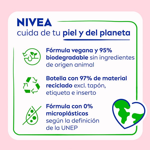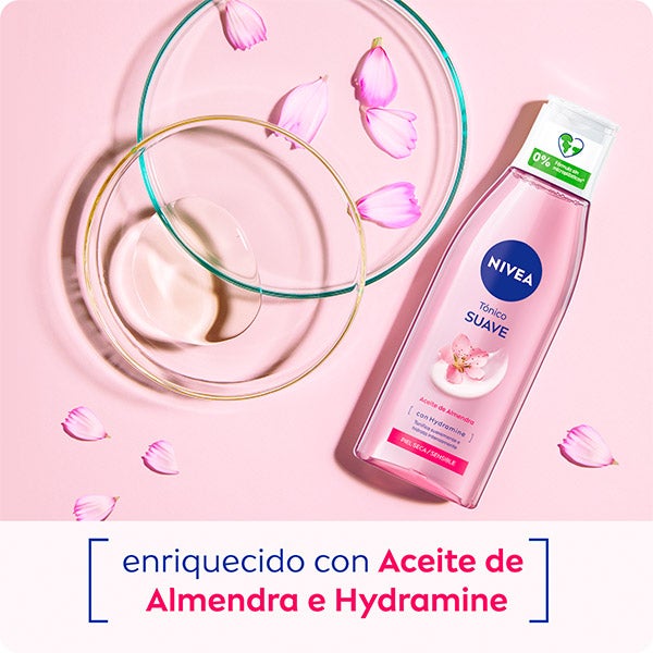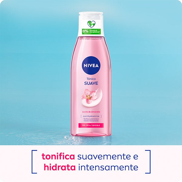 NIVEA Tónico Facial Suave, enriquecido con Aceite de Almendra y Hydramine, ayuda a mantener la hidratación natural de la piel. Creado especialmente para pieles secas y sensibles, no solo refresca y elimina los residuos restantes del rostro, sino que además proporciona una intensa sensación de suavidad y confort. ¿El resultado? Una piel tonificada, cuidada y con un aspecto saludable, preparada para seguir con tu rutina diaria de cuidado facial. Su compatibilidad con la piel ha sido comprobada dermatológicamente.