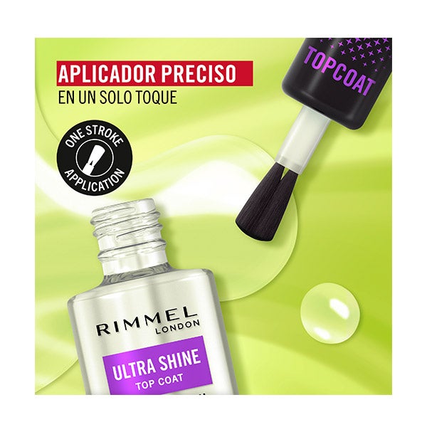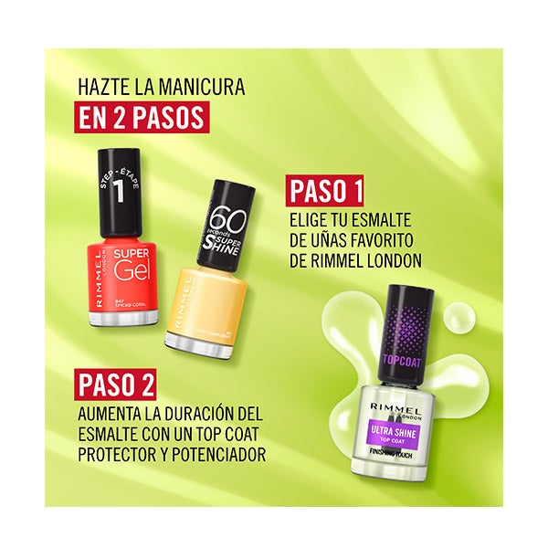 Consigue una manicura sana, luminosa y de larga duración con una sola capa. El esmalte Ultra Shine Top Coat de Rimmel London es el secreto para lograr un acabado profesional y radiante en tus uñas.