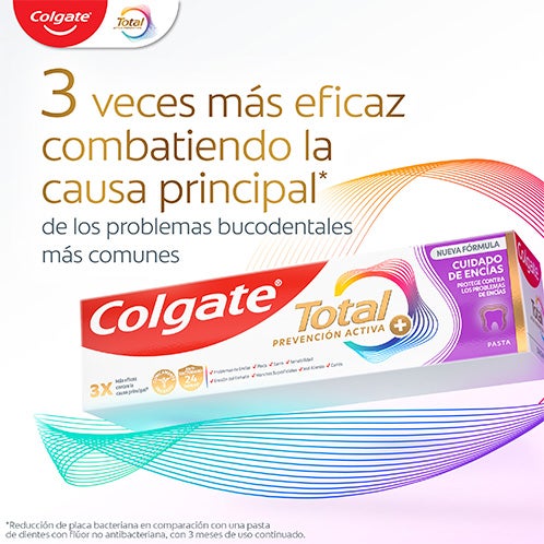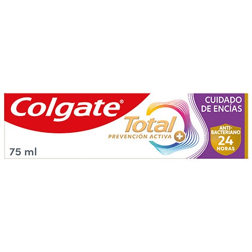 Mantén tus encías saludables y una sonrisa luminosa protegida con la pasta dental Colgate Total Advanced Encías Sanas. Este dentífrico especializado no solo cuida y favorece la salud de las encías, sino que también fortalece las defensas naturales de la boca y ofrece 24 horas de defensa antibacteriana* gracias a su tecnología con Zinc-Amino. Contiene flúor, que ayuda a prevenir la caries, mientras elimina la placa y refuerza el esmalte dental. Además, revitaliza las encías, disminuye la formación de sarro, protege los dientes sensibles, aclara el esmalte y refresca el aliento, aportando una sensación de limpieza total. Ofrece a tus dientes y encías la protección que merecen y disfruta de una sonrisa radiante durante todo el día con este dentífrico antibacteriano.