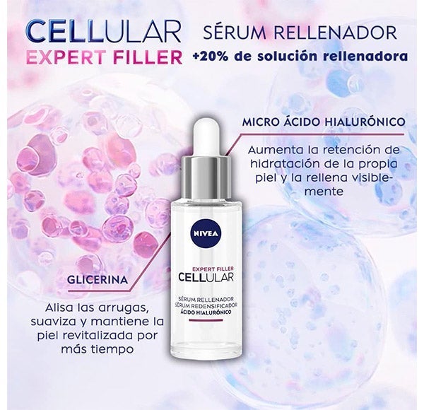 Cellular Expert Filler Sérum Rellenador Ácido Hialurónico: Una fórmula innovadora que estimula la actividad celular* y ayuda a reducir los signos visibles del envejecimiento. Su composición concentra un 20% de solución rellenadora con Micro Ácido Hialurónico puro y Glicerina, dejando la piel más lisa y con un aspecto visiblemente más relleno.