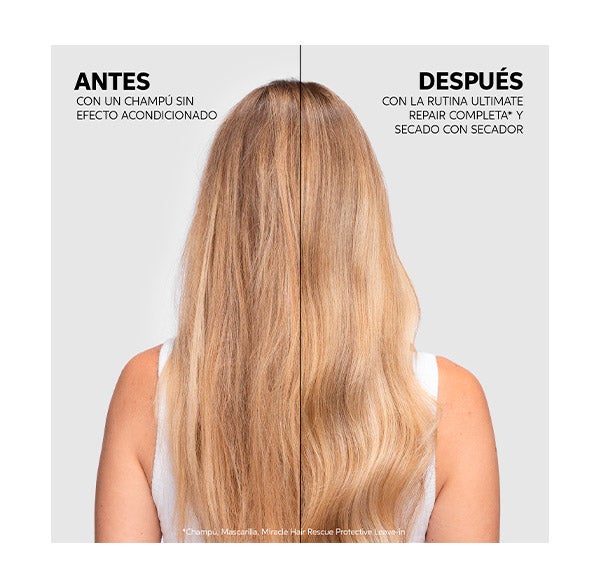 Está diseñada para reparar el daño intenso causado por el uso de herramientas térmicas, exposición solar, procesos decolorantes, gomas o extensiones. Su fórmula penetra en profundidad para revitalizar la fibra capilar, reforzarla y aportar una suavidad ligera. Ideal para cualquier tipo de cabello.