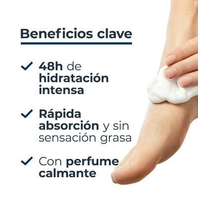 Espuma de textura muy ligera y de absorción inmediata, creada para atender las necesidades de la piel seca o extremadamente seca en los pies. Ideal para piel madura, xerosis, psoriasis o diabetes, y también como tratamiento de apoyo.