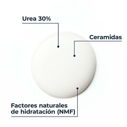 Este cuidado corporal de acción exfoliante e hidratante está formulado para zonas muy secas, engrosadas o ásperas como manos, codos, rodillas y pies. Su combinación de urea, que favorece la hidratación y el proceso natural de exfoliación; ceramidas, que refuerzan la barrera cutánea; y factores naturales de hidratación, que ayudan a evitar la pérdida de agua, la convierte en una excelente opción para tratar afecciones cutáneas como hiperqueratosis, psoriasis o eccemas hiperqueratósicos. Proporciona resultados visibles después de una semana de uso.