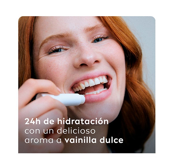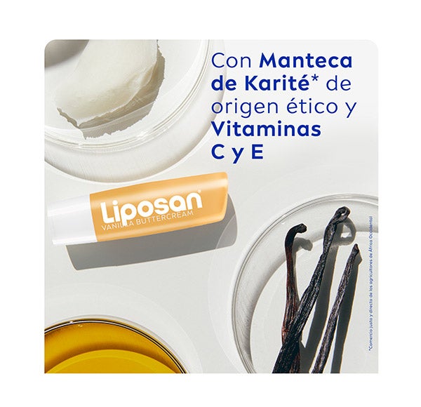 El bálsamo labial Liposan Vanilla Buttercream ofrece a tus labios una fragancia irresistible a vainilla mientras los nutre y cuida intensamente. Su fórmula, con Manteca de Karité y aceites naturales ricos en Vitaminas, posee una textura ligera que se derrite al instante sobre los labios, aportando hidratación continua durante 24 horas. Siente unos labios increíblemente suaves, con un acabado natural y listos para besar, acompañados de un aroma que te enamorará. Compatibilidad dermatológicamente comprobada.