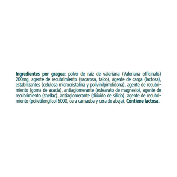 Ingredientes por gragea: polvo de raíz de valeriana (Valeriana officinalis) 200mg; agente de recubrimiento (sacarosa, talco); agente de carga (lactosa); estabilizantes (celulosa microcristalina y polivinilpirrolidona); agente de recubrimiento (goma de acacia); antiaglomerante (estearato de magnesio); agente de recubrimiento (shellac); antiaglomerante (dióxido de silicio); agente de recubrimiento (polietilenglicol 6000, cera carnauba y cera de abeja). Contiene lactosa.