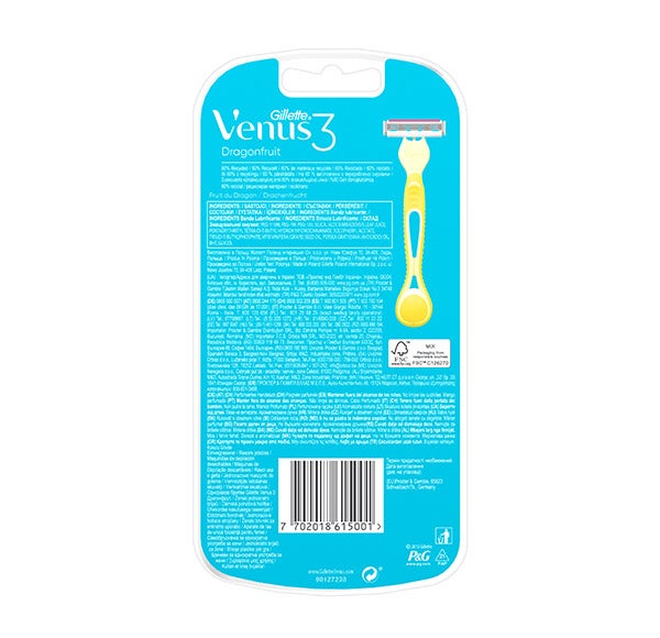 Las maquinillas desechables para mujer Gillette Venus 3 Dragonfruit ofrecen una depilación suave y precisa a un costo sorprendente. Incorporan 3 hojas curvas junto con un cabezal pivotante que se adapta a las variaciones naturales de los contornos del cuerpo. Estas maquinillas incluyen una banda lubricante que se activa con el contacto del agua para hacer más cómode el afeitado y permitir un deslizamiento uniforme. Además, la banda contiene un leve aporte de vitamina E. Estas versiones desechables están disponibles en distintos tonos y mangos perfumados con aroma a pitahaya, aportando una fragancia tropical y refrescante.