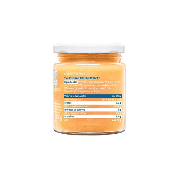 Verduras [(47%) (calabaza, judía verde, patata, cebolla)], agua de cocción, merluza salvaje (9%) arroz y aceite de oliva virgen extra (1%).