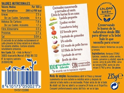 Los tarritos de Hero Baby Verduritas de la Huerta con Pollo y Ternera forman parte de una amplia gama de tarritos de carne para una alimentación equilibrada a partir de los 6 meses. Formato 235g.