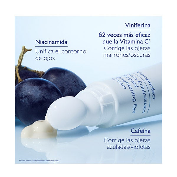 El Tratamiento de Ojos Iluminador Vinoperfect actúa sobre todos los tipos de ojeras, ya sean de origen vascular (tonos azulados o violáceos) o pigmentario (coloración marrón o grisácea).
