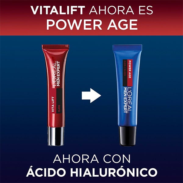 Potencia la piel de tu rostro frente al envejecimiento con L'Oréal Men Expert POWER AGE, el contorno de ojos antiedad enriquecido con ácido hialurónico.