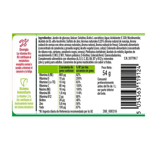 Jarabe de glucosa; azúcar; gelatina; Ácido L-ascórbico: Agua: Acidulante: E330; Nicotinamida: Acetato de DL- alfa-tocoferilo:sulfato de zinc: aromas naturales 0.25% (aroma natural de naranja, aroma natural de cereza con otros aromas naturales; aroma natural, aroma natural fresa) Colorante alimentario (concentrado de zanahoria y grosella negra) Aceite vegetal (coco, colza) colorante alimentario (concentrado de rábano rojo, cártamo, zanahoria negra, cereza) Piridoxina clhorhidrato; Acetato de retinilo: Agentes de recubrimiento: E903, E901; Yoduro potásico; D-biotina: Colecalciferol: Cianocobalamina.