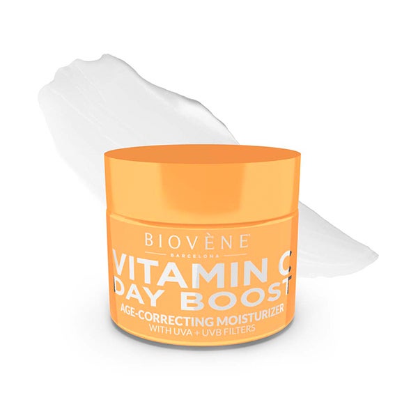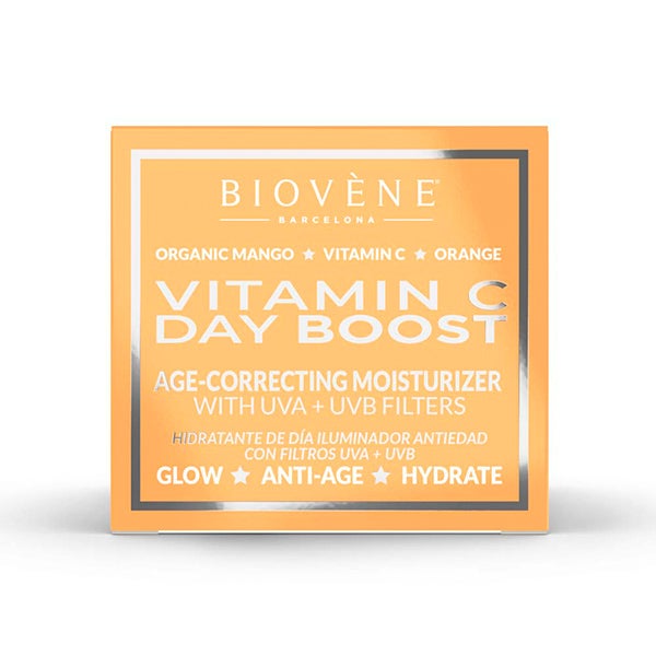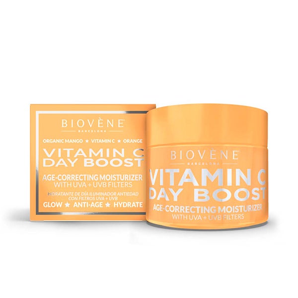 Crema de día hidratante DAY BOOST correctora de edad elaborada con vitamina C y mango orgánico, que nutre de inmediato la piel para revitalizar su luminosidad y devolverle un aspecto juvenil.