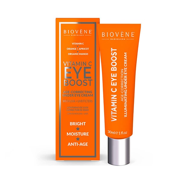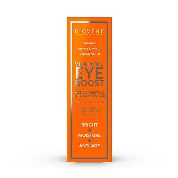 El tratamiento contorno de ojos EYE BOOST es un hidratante de uso diurno y nocturno con efecto corrector que contribuye al rejuvenecimiento de la zona inferior de los ojos. Su fórmula con vitamina C y mango orgánico ayuda a disminuir la aparición de ojeras, líneas finas y aporta frescura a la piel fatigada.