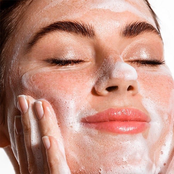 1. Sin agitar el envase, presiona dos veces para depositar la cantidad adecuada de Espuma Limpiadora en la palma de la mano.