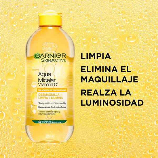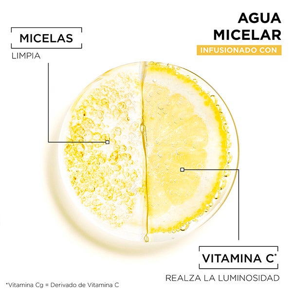 Agua Micelar con vitamina C que purifica, elimina el maquillaje y aporta luminosidad a la piel con aspecto cansado.