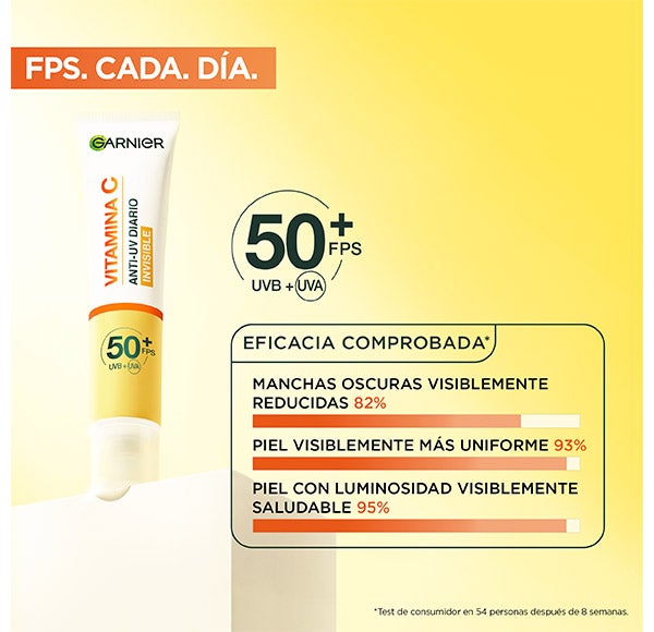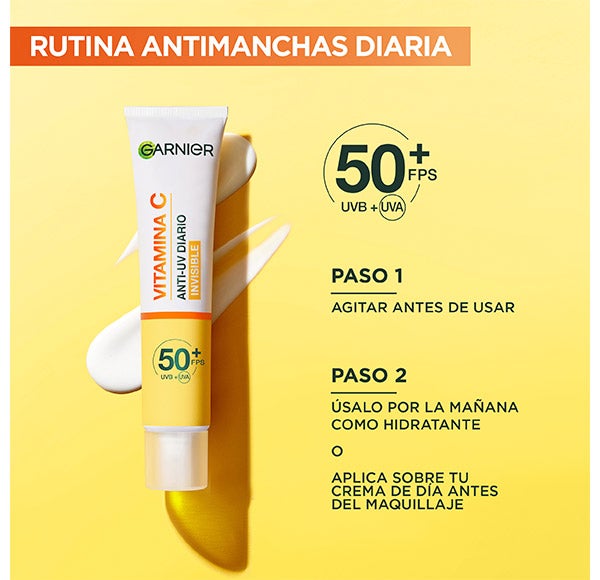 Fluido UV Diario Iluminador Invisible con SPF50+ que ayuda a proteger la piel, prevenir la aparición y disminuir las manchas oscuras del rostro. Pensado para renovar tu rutina facial, este fluido cuenta con eficacia comprobada: -53% manchas oscuras*, +43% piel con mayor luminosidad y +40% tono más uniforme.