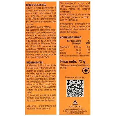 Complemento alimenticio con vitamina C, zinc y selenio con edulcorantes. Sin azúcares. Sin gluten. Sin lactosa. La vitamina C, el zinc y el selenio contribuyen al funcionamiento normal del sistema inmunitario. Ayuda a disminuir el cansancio y la fatiga gracias a su contenido en vitamina C. Sabor naranja.