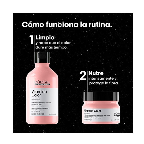 Mascarilla Vitamino Color (250ml): Contribuye a conservar la belleza del color hasta por 8 semanas, ayudando a preservar su viveza y brillo. Su fórmula profesional con Resveratrol protege la fibra capilar y limpia con delicadeza, proporcionando al instante un tacto sedoso y un aspecto resplandeciente de la raíz a las puntas.