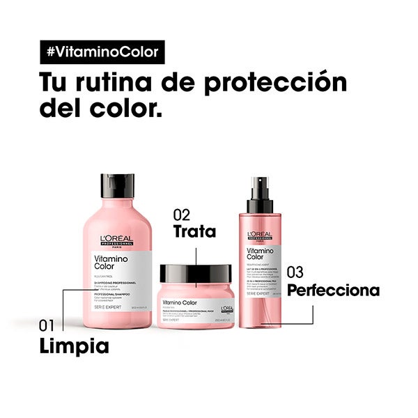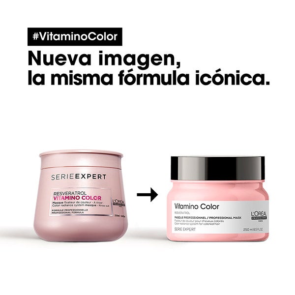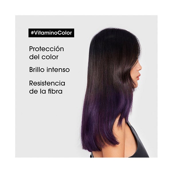 La Mascarilla Vitamino Color para cabello teñido restaura las zonas sensibilizadas, cubriéndolas con una película ligera que las resguarda del desgaste diario. Proporciona hasta 5 veces más brillo tras su uso y mantiene la luminosidad durante 48 horas.