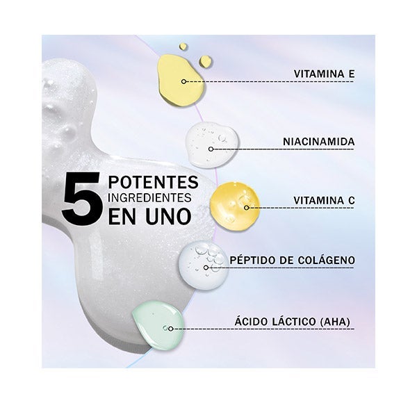 Formulado con una mezcla concentrada de 5 potentes ingredientes: Niacinamida, Vitamina C, Péptido de Colágeno, Vitamina E y Ácido Láctico (AHA).
