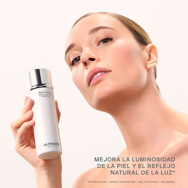 ESSENCE-IN-LOTION ILUMINADORA DE LA PRAIRIE, formulada para mejorar la luminosidad de la piel y actuar como un pretratamiento que refuerza y revitaliza su textura. Su esencia ligera y fluida se absorbe de inmediato, dejando un brillo natural y una sensación de suavidad sin residuo graso.