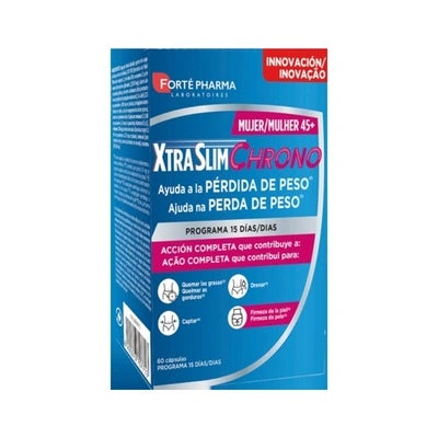 Descubre Forte Pharma XtraSlim Chrono Perder Peso, un complemento alimenticio diseñado específicamente para mujeres a partir de 45 años, con una combinación exclusiva de 10 ingredientes activos que favorecen la pérdida de peso, la quema de grasa y el bienestar de la piel.