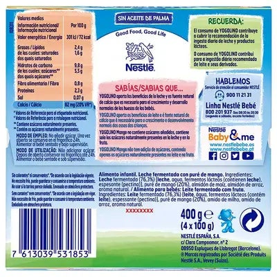 YOGOLINO se ha desarrollado para ayudar a cubrir las necesidades nutricionales de los más pequeños. El consumo de YOGOLINO contribuye a cubrir la recomendación de ingesta diaria de leche y productos lácteos. La variedad YOGOLINO Mango, aporta todo lo bueno de la leche ayudando a tu bebé a tener un crecimiento saludable. Además, no contiene azúcares añadidos, contiene los naturalmente presentes en la leche y la fruta. Es fuente natural de Calcio que contribuye al crecimiento y desarrollo normal de los huesos de los bebés y tiene una composición adaptada para los más pequeños por su cantidad adecuada de proteínas y grasas de acuerdo con sus necesidades.