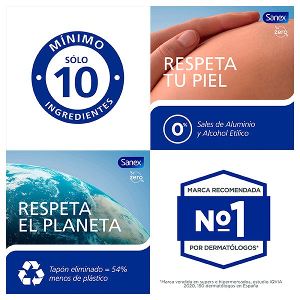 Brinda una protección efectiva frente al mal olor durante 48 horas, contribuyendo a mantener tu piel hidratada y con un aspecto saludable mientras te aporta una agradable sensación de frescor. Sanex 0% emplea ingredientes naturales, sin aluminio ni alcohol, lo que ayuda a disminuir su impacto ambiental y a generar menos residuos en su envase.